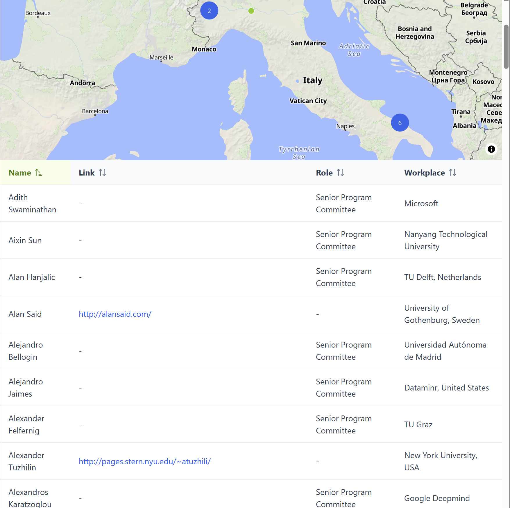 We updated our recommender-systems expert map to a new system. It’s not yet perfect, e.g. for some entries the roles are missing, and members of the ACM TORS editorial board cannot yet be automatically parsed (“thank you” Cloudflare). But in general, it’s much nicer to use. Different experts in the same location are grouped together, and there is a sortable table view.